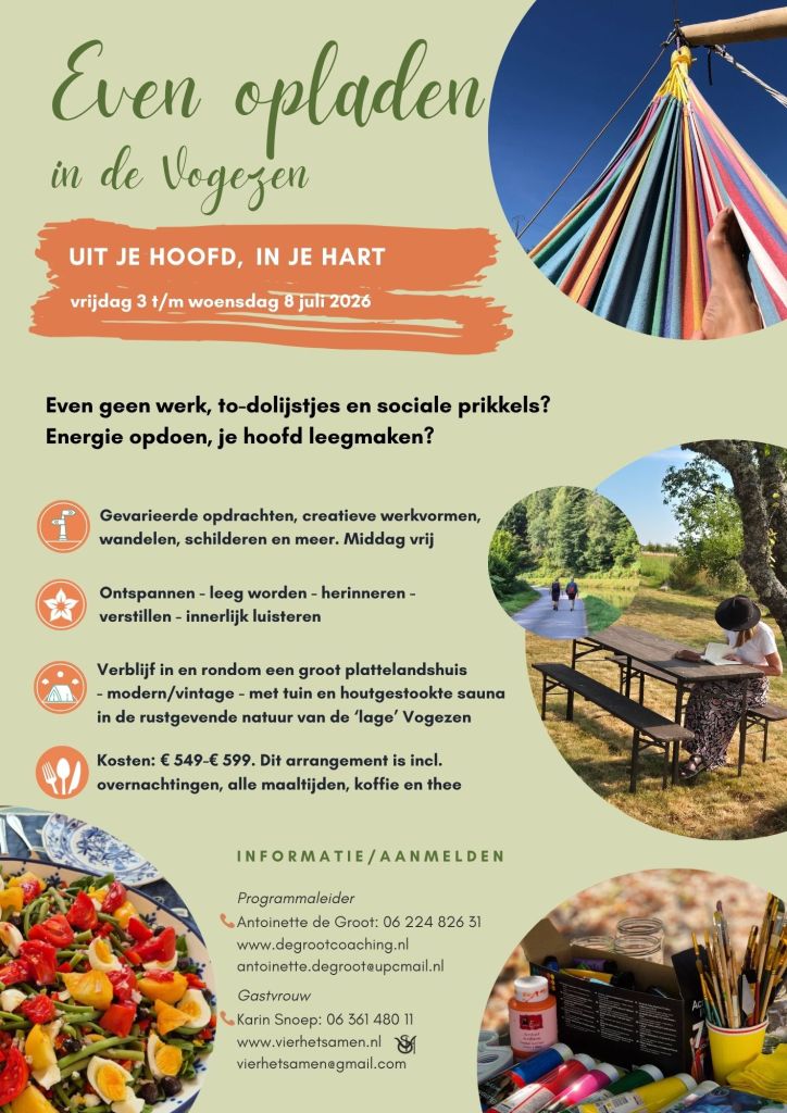 Ook dit jaar biedt Vier het Samen in samenwerking met Antoinette de Groot een mooi vierdaags programma in de Franse Vogezen. In de ochtenden: gevarieerde opdrachten, creatieve werkvormen, wandelen, schilderen en meer. De middagen zijn vrij te besteden. Dus wil je een fietstocht maken langs het Canal de l’Est, een mooie wandeling maken in de omgeving, genieten van de houtgestookte sauna, even helemaal niets doen? Dat kan allemaal! Meld je nu aan: er is plek voor maximaal 12 personen.